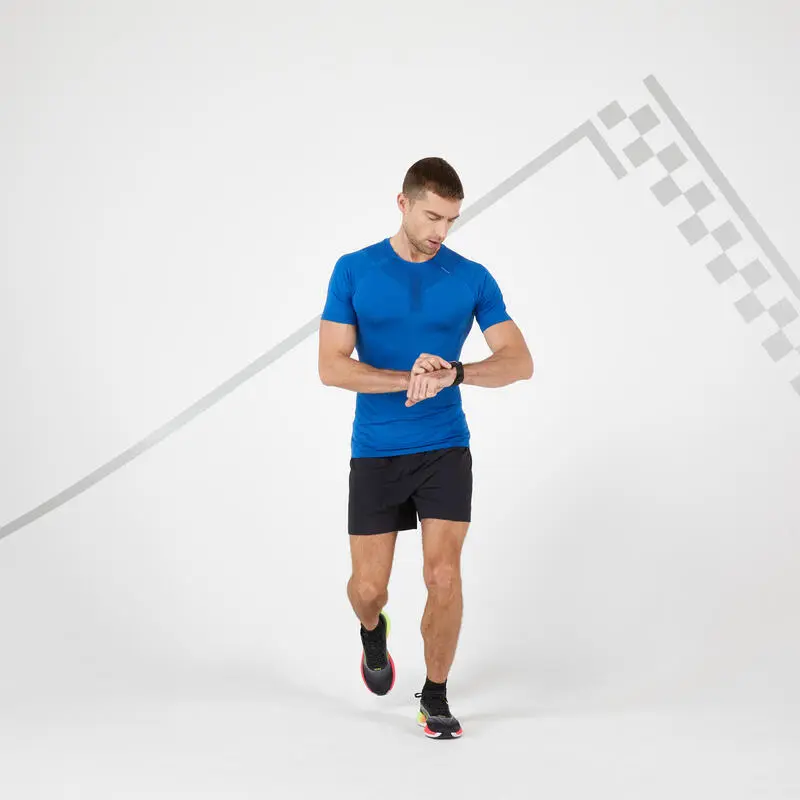 Compra en Decathlon Camiseta running transpirable Hombre Kiprun Skincare negra Camiseta de manga corta de running para hombre, transpirable y ajustada, para correr con calor. Sin costuras en la parte delantera para limitar las rozaduras.