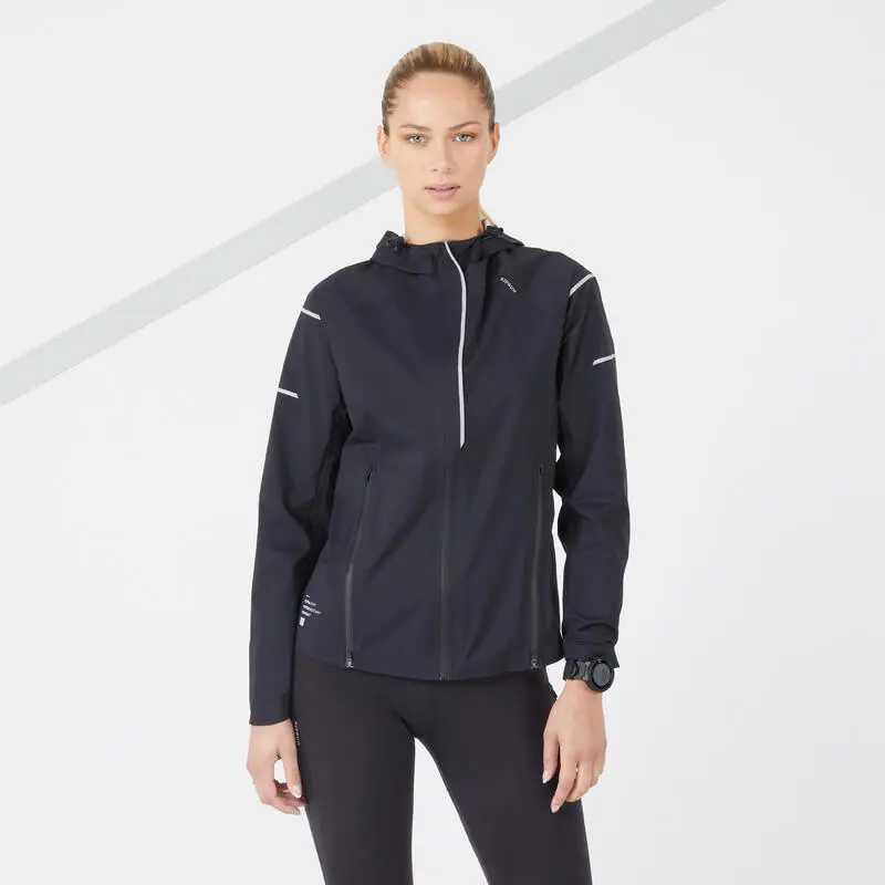 Compra en Decathlon CHAQUETA DE RUNNING MUJER IMPERMEABLE CORTAVIENTO – KIPRUN RAIN+ NEGRO Nuestros diseñadores, practicantes de running, han desarrollado esta chaqueta de running impermeable para las salidas largas bajo la lluvia.