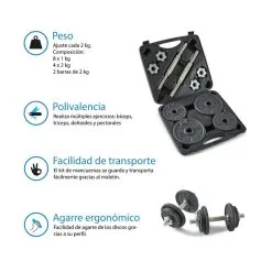Compra en Decathlon Kit mancuernas 20 kg musculación Corength Kit de discos y barras de 28mm con contenido del maletín: 2 barras de rosca de 2 kg, 4 tuercas de ajuste cromadas, 8 discos de 1 kg y 4 discos de 2 kg.